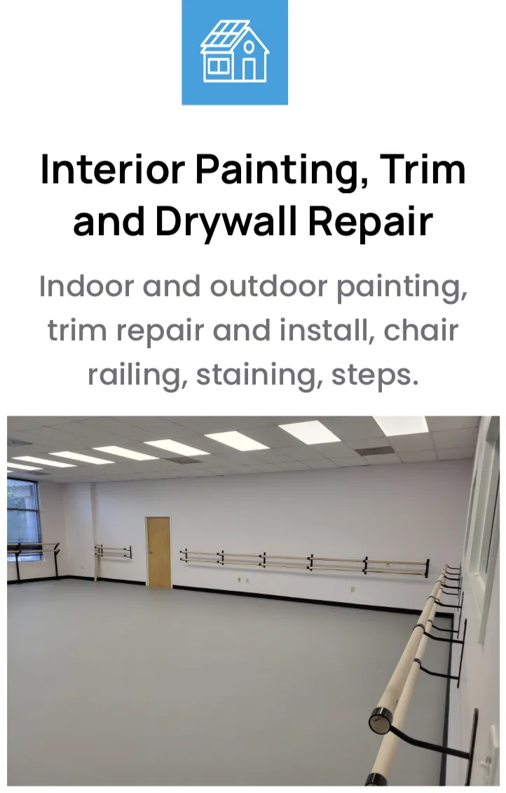 Indoor and outdoor painting, trim repair and install, chair railing, staining, steps.